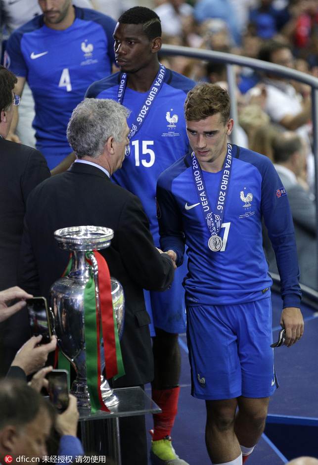 北京时间7月11日凌晨3点,2016年欧洲杯决赛在法国的圣丹尼斯的法兰西大球场打响,东道主法国队迎战葡萄牙队,最终发箍队0-1败给葡萄牙队,无缘本土夺冠,众将赛后飙泪。图为格列兹曼被授予亚军奖牌。