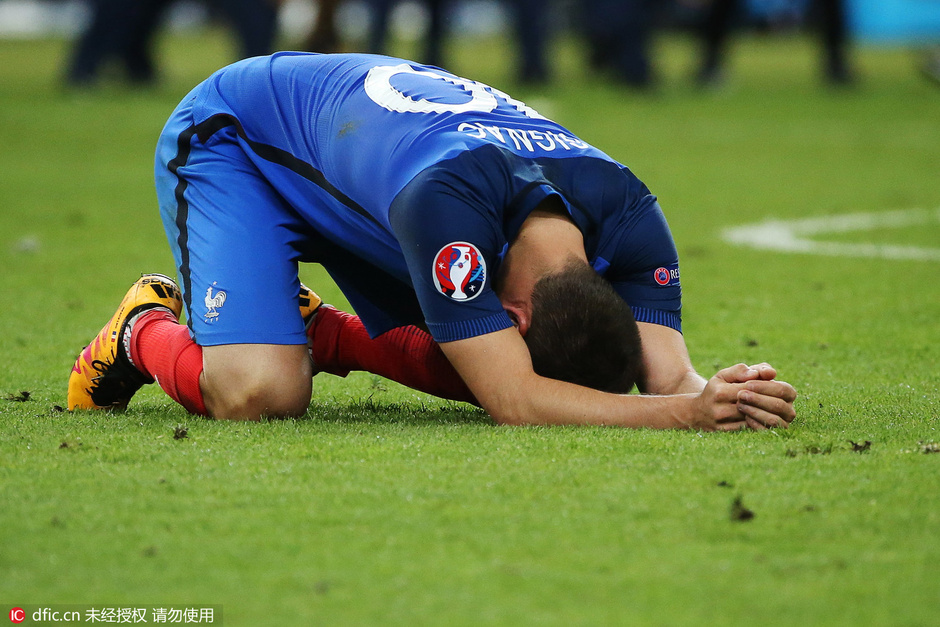 北京时间7月11日凌晨3点,2016年欧洲杯决赛在法国的圣丹尼斯的法兰西大球场打响,东道主法国队迎战葡萄牙队,最终发箍队0-1败给葡萄牙队,无缘本土夺冠,众将赛后飙泪。图为吉尼亚克跪倒在地。