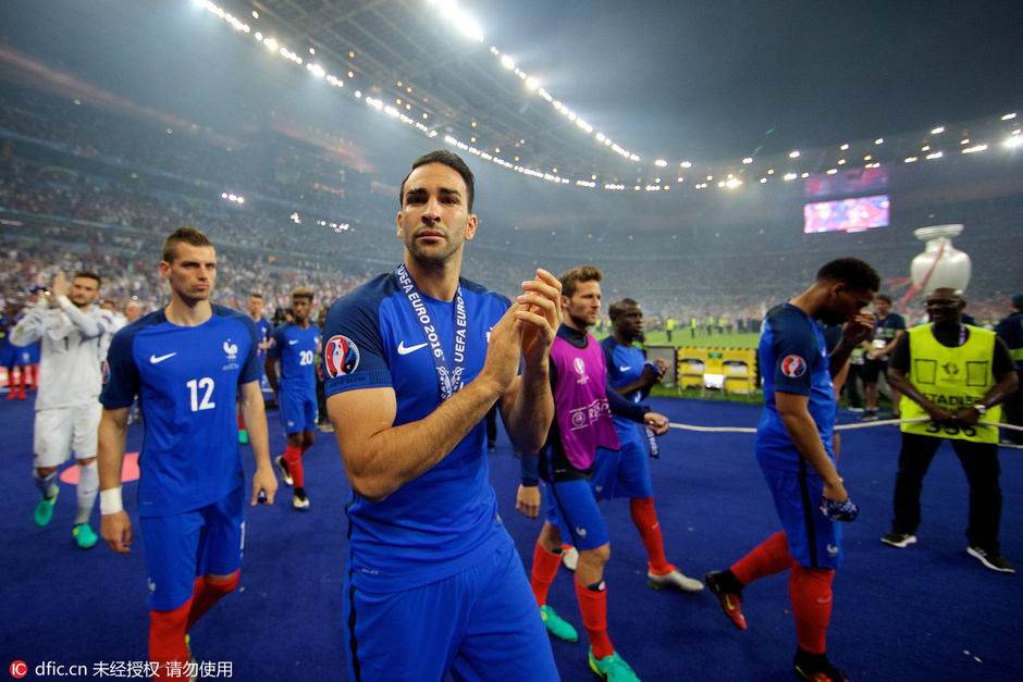 北京时间7月11日凌晨3点,2016年欧洲杯决赛在法国的圣丹尼斯的法兰西大球场打响,东道主法国队迎战葡萄牙队,最终发箍队0-1败给葡萄牙队,无缘本土夺冠,众将赛后飙泪。图为法国队示意球迷。